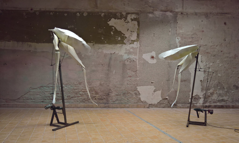 This installation consists of to insect-like objects, which move their legs in an unpredictable rhythm up and down. It reminds of a form of communication, where both love or hate can be of motivation.
